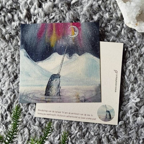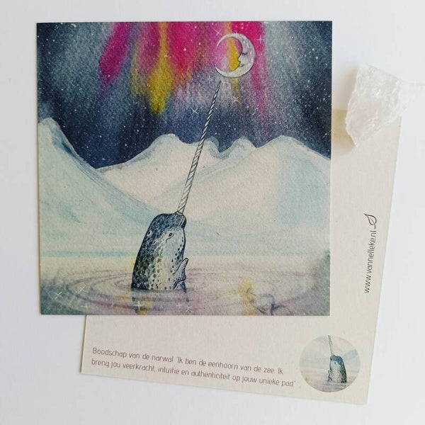 De achterzijde bevat een kleine bijpassende illustratie en de boodschap van de narwal. De kaart is 15x15 cm en er zijn geen adreslijntjes; dit biedt extra veel schrijfruimte.