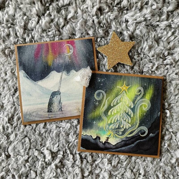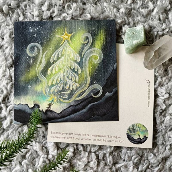 De achterzijde bevat een kleine bijpassende illustratie en de boodschap van het Meisje met de zwavelstokjes. De kaart is 15x15 cm en er zijn geen adreslijntjes; dit biedt extra veel schrijfruimte.