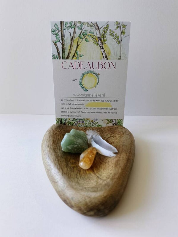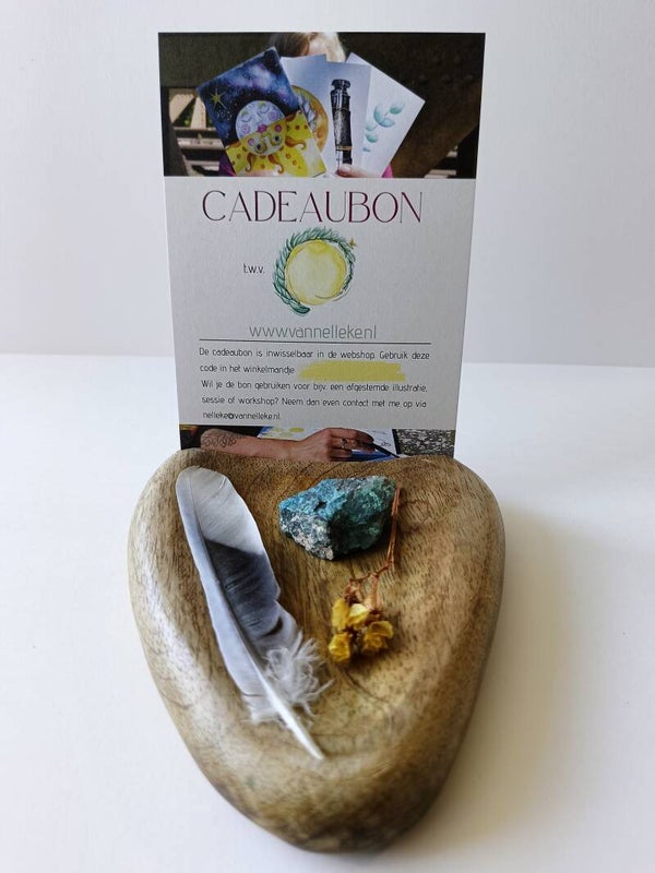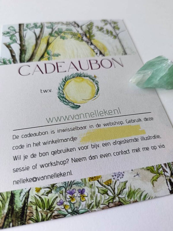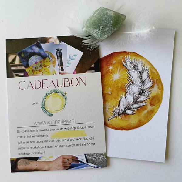 Met deze cadeaubon geef je degene die jij liefhebt een budget om te shoppen in mijn winkeltje òf om te besteden bij een workshop, tekensessie of afgestemde illustratie. Een uniek, duurzaam en creatief cadeau waarmee je de ander gegarandeerd een sprankje liefde en licht kunt bezorgen. Of er nou wat te vieren valt, of degene een hart onder de riem kan gebruiken.