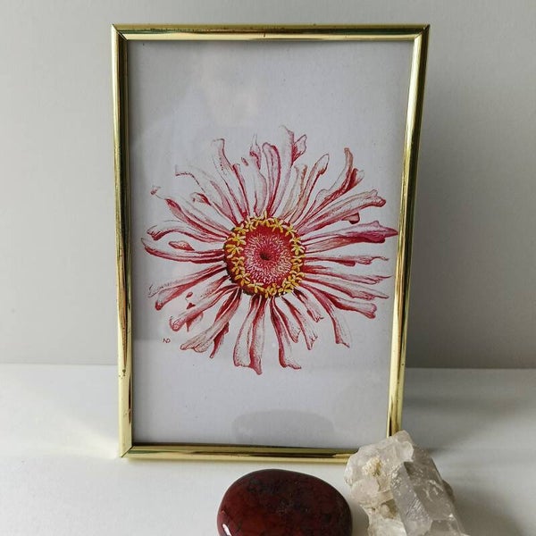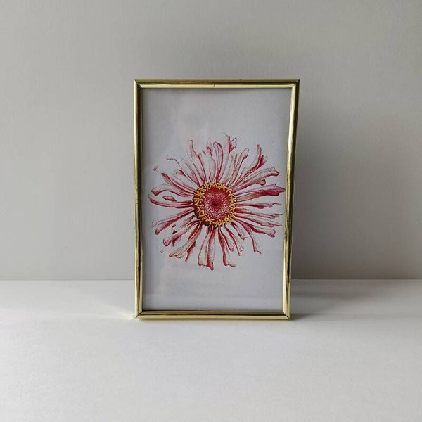 Een ansichtkaart van de Zinnia-bloem in een lief goudkleurig vintage lijstje van 15,5 x 10,5 cm.
