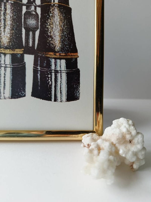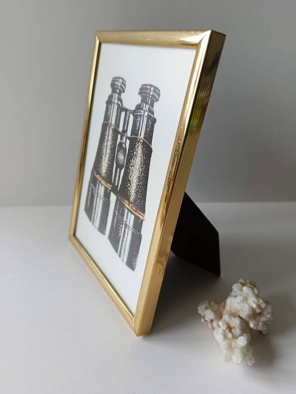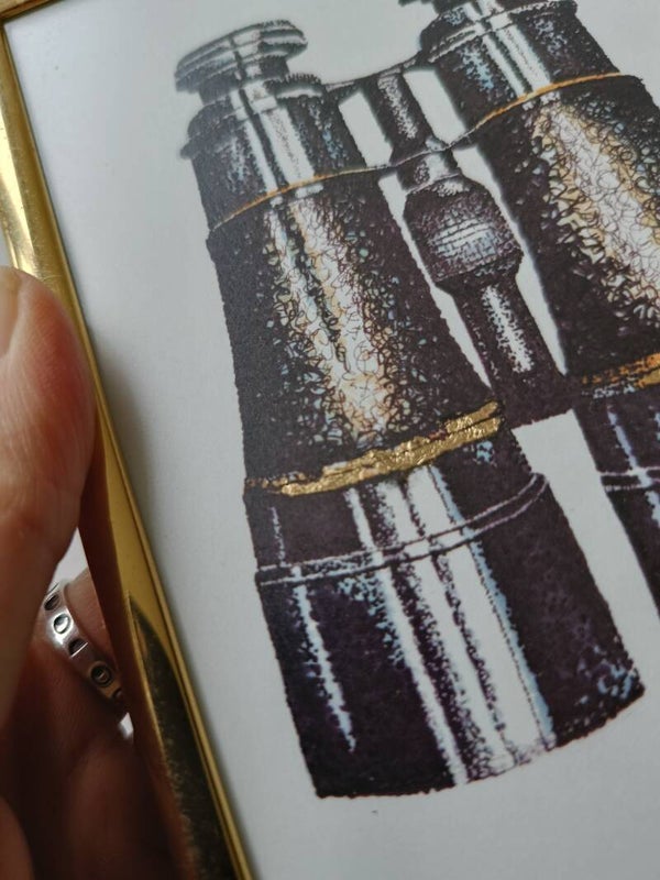De verrekijker op deze kaart heeft een met de hand aangebracht goudaccent en is ingelijst in een schattig vintage lijstje van 15,2 x 10,8 cm groot.